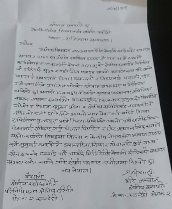 आज जिल्ला पार्टी कार्यालय भैरहवा पुगेर लम्सालले राजीनामा बुझाउनु भएको हो । पार्टीले एकलौटी र षडयन्त्रपूर्वक नगर प्रमुखहरुको नाम सिफारिस गरेको उहाँको आरोप छ । उहाँ बुटवल उपमहानगरमा मेयरको दाबेदार हुनुहुन्थ्यो।