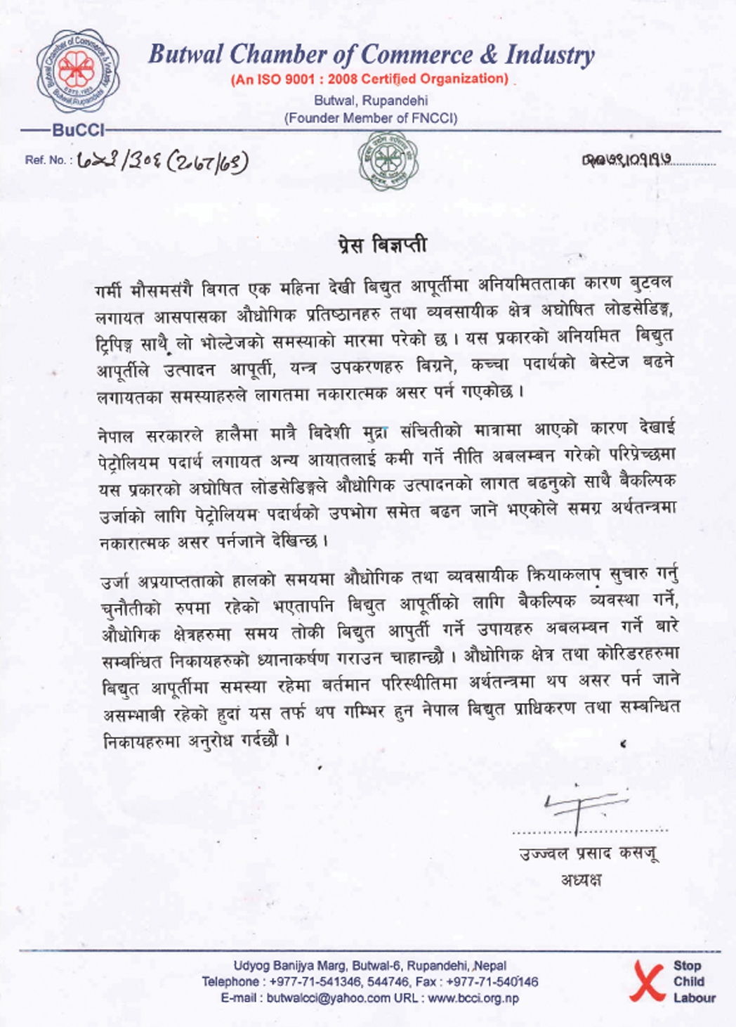 विद्युत आपूर्तिलाई नियमित गर्न बुटवल उद्योग वाणिज्य संघको आग्रह