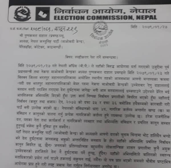 निर्वाचन आयोगले प्रचण्डलाई सोध्यो २४ घण्टे स्पष्टीकरण