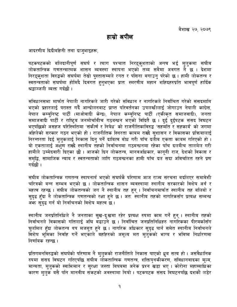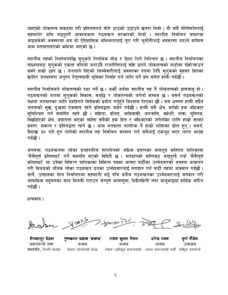 स्थानीय तह निर्वाचनका लागि मौन अवधि सुरु हुन अघि मंगलबार साँझ एक विज्ञप्ति जारी गर्दै सत्ता गठबन्धनमा रहेका नेपाली कांग्रेस, माओवादी केन्द्र, एकीकृत समाजवादी, जनता समाजवादी र राष्ट्रिय जनमोर्चाले स्थानीय तह नै लोकतन्त्रको प्राणवायु भएको भन्दै गठबन्धनको पक्षमा मतदात गर्न आह्वान गरेका हुन् ।