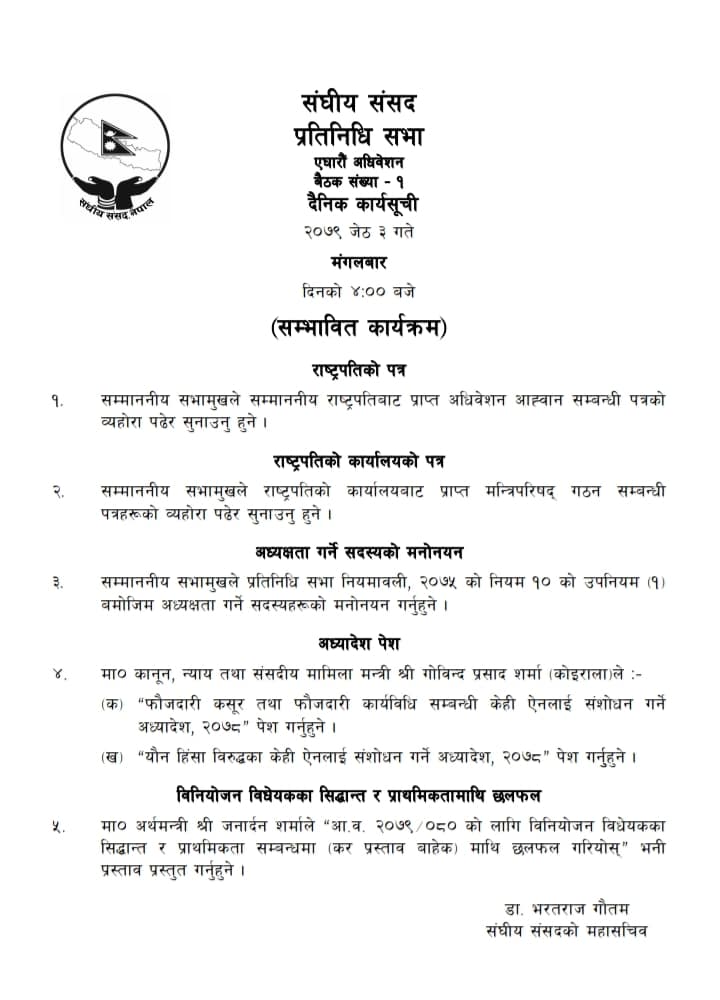 यसअघि सभामुखले राष्ट्रपतिबाट प्राप्त अधिवेशन आह्वान सम्बन्धी पत्रको व्यहोरा पढेर सुनाउने, सभामुखले प्रतिनिधि सभा नियमावली, २०७५ को नियम १० को उपनियम (१) बमोजिम अध्यक्षता गर्ने सदस्यहरूको मनोनयन गर्ने, कानुन, न्याय तथा संसदीय मामिला मन्त्री गोविन्द प्रसाद शर्मा (कोइराला) ले फौजदारी कुसुर तथा फौजदारी कार्यविधि सम्बन्धी केही ऐनलाई संशोधन गर्ने अध्यादेश, २०७८ र यौन हिंसाविरुद्धका केही ऐनलाई संशोधन गर्ने अध्यादेश, २०७८“ पेस गर्ने कार्यसूचीमा उल्लेख छ ।