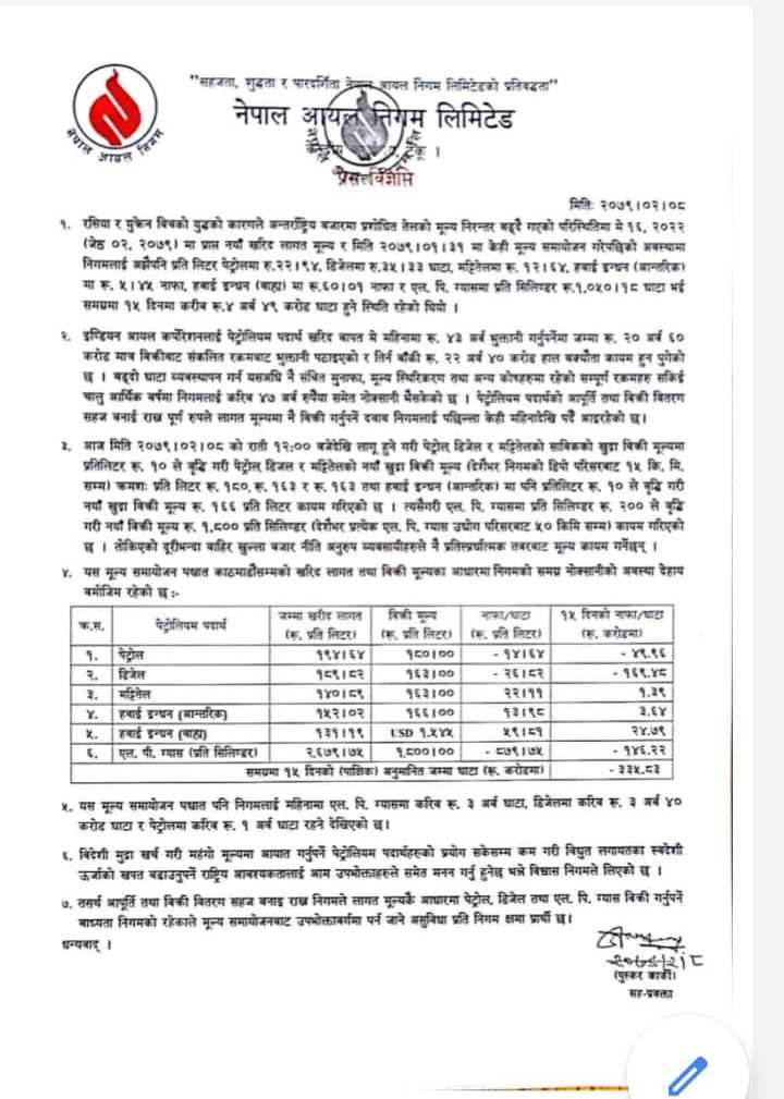 निगमले पेट्रोल, डिजेल र मट्टितेल प्रतिलिटर १० रुपैयाँका दरले बढाउँदा खाना पकाउने ग्यासको मूल्य प्रतिसिलिण्डर २ सय रुपैयाँ बढाएको छ ।