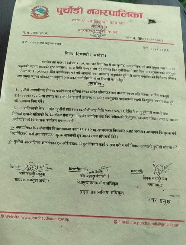 पुर्चौडी नगरपालिकाका १० वटै वडाहरूमा विद्युत् विस्तार कार्य प्रारम्भ गरी दुई वर्षभित्रमा उज्यालो पुर्चोडी घोषणा गर्ने निर्णय पनि गरिएको छ ।