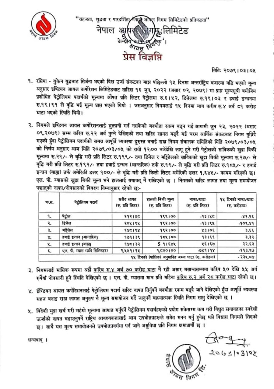 निगमले हवाई इन्धनमा पनि आन्तरिक तर्फ १९ रुपैयाँले वृद्धि गरी १८५ रुपैयाँ प्रतिलिटर पुर्याएको छ । हवाई इन्धनको बाह्यतर्फ भने १०० अमेरिकी डलरले मूल्यवृद्धि गरिएको छ ।