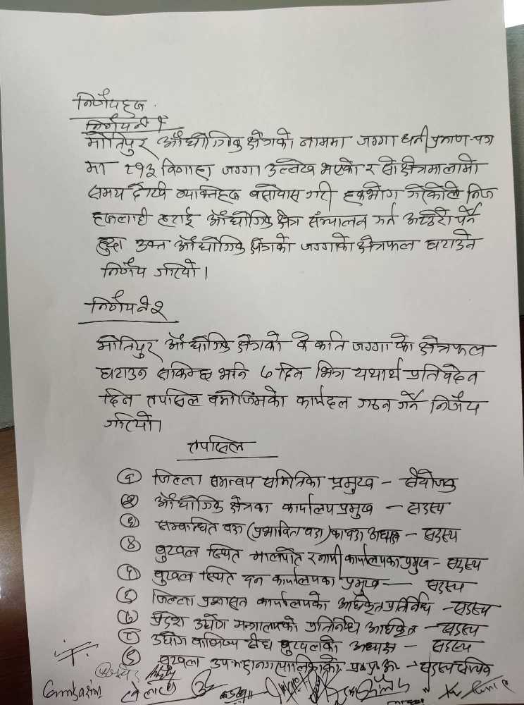 प्रमुख पाण्डेयका अनुसार कार्यदललाई मोतीपूर औद्योगिक क्षेत्रको के कति जग्गाको क्षेत्रफल घटाउन सकिन्छ, भनी ७ दिनभित्र यथार्थ प्रतिवेदन दिने गरी अधिकार निर्णय गरेको छ ।