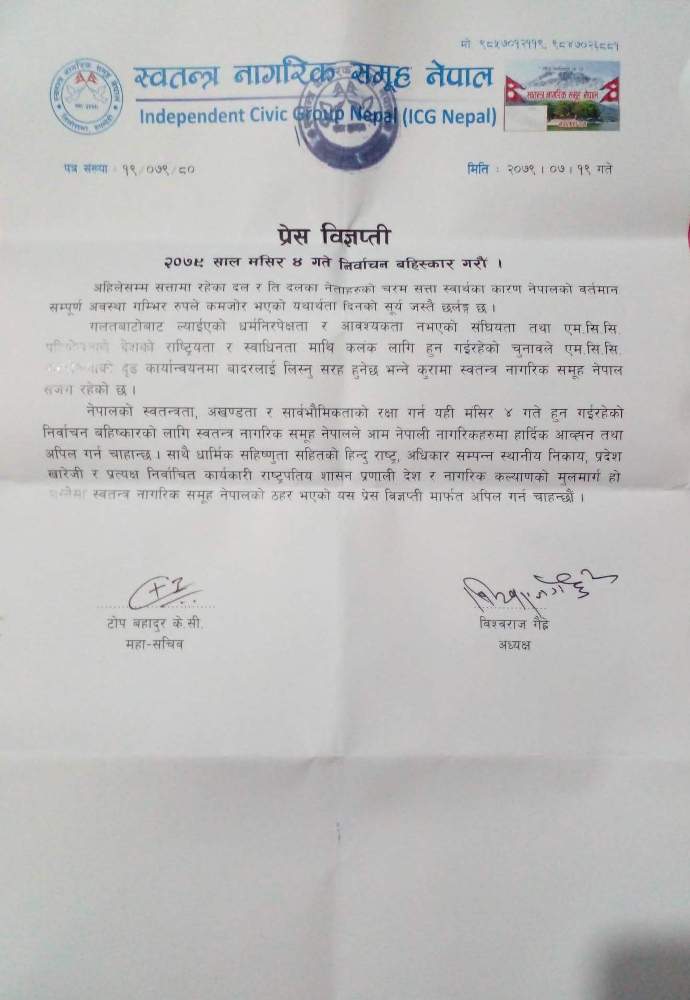 स्वतन्त्र नागरिक समुह नेपालद्धारा निर्वाचन बहिस्कार गर्न अपिल