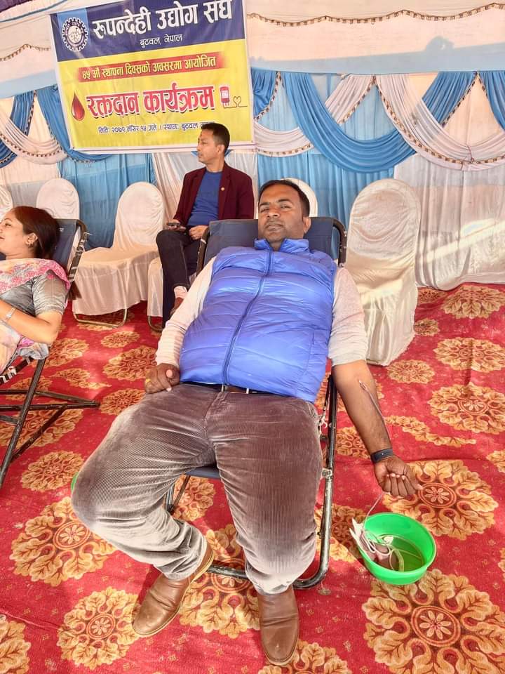 बुटवल । रुपन्देही उद्योग संघले आफ्नो ४५ औं स्थापना दिवश एवम उद्योग दिवशका अवसरमा विहीवार बुटवलमा रक्तदान तथा मानव सेवा आश्रममा त्यहाँ रहेका सदस्यहरुलाई खाना खुवाउने कार्यक्रम सम्पन्न गरेको छ ।