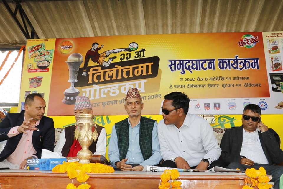 रुपन्देही जिल्ला फुटबल संघ अध्यक्ष लोक पुनको सभापतित्वमा सम्पन्न कार्यक्रममा संबिधान सभा सदस्य जगदिशनर सिंह केसी, अखिल नेपाल फुटवल संघ एन्फाका केन्द्रीय उपाध्यक्ष दिर्घ बहादुर केसी, लुम्बिनी प्रदेश खेलकुद विकास परिषदका सदस्य सचिब जय प्रकाश भट्टराई लगायतले तिलोत्तमा गोल्डकपको महत्वबारे चर्चा गर्नु भएको थियो ।