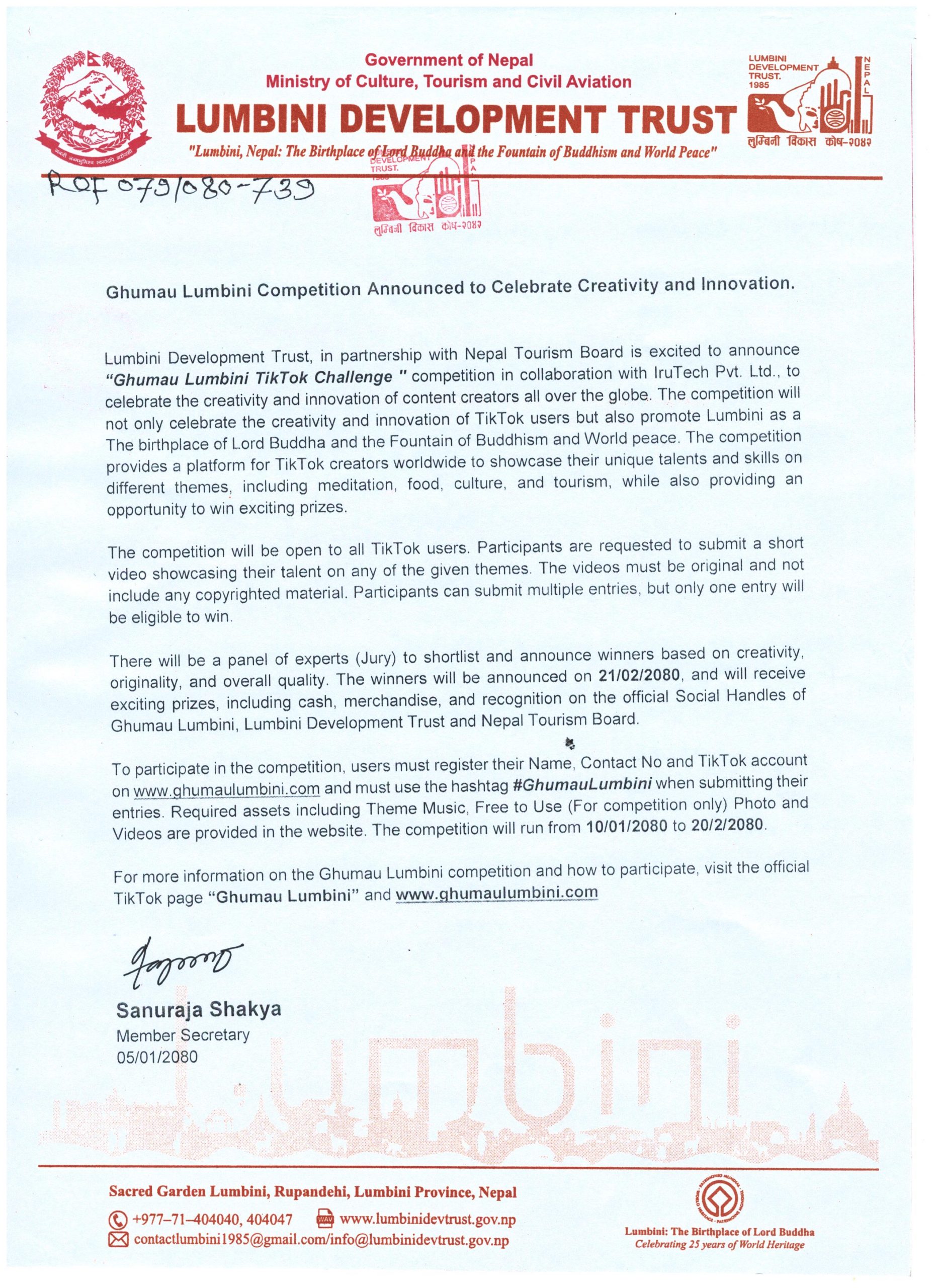 चैत १७ गते संस्कृति, पर्यटन तथा नागरिक उडडयन मन्त्री सुदन किराँतीको अध्यक्षतामा लुम्बिनीमा बसेको बोर्ड लुम्बिनी विकास कोषको बैठकले बुद्ध जयन्तीको अवसरमा टिकटक प्रतियोगिता गर्ने निर्णय गरेको थियो ।