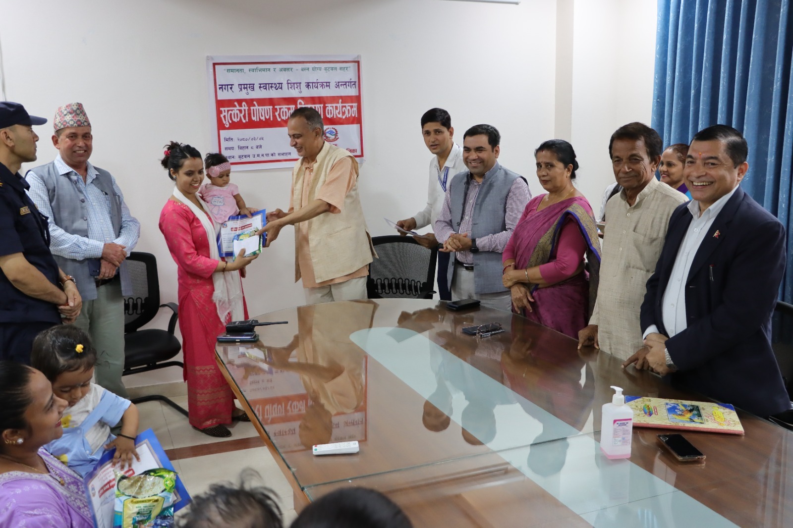 जस अनुसार मंगलबार कार्यक्रमको शुभारम्भ गर्दै नगरप्रमुख खेलराज पाण्डेयले ५० जना नवजात शिशुका आमाहरुलाई रकम तथा पोषण सामग्री हस्तान्तरण गर्नुभयो ।