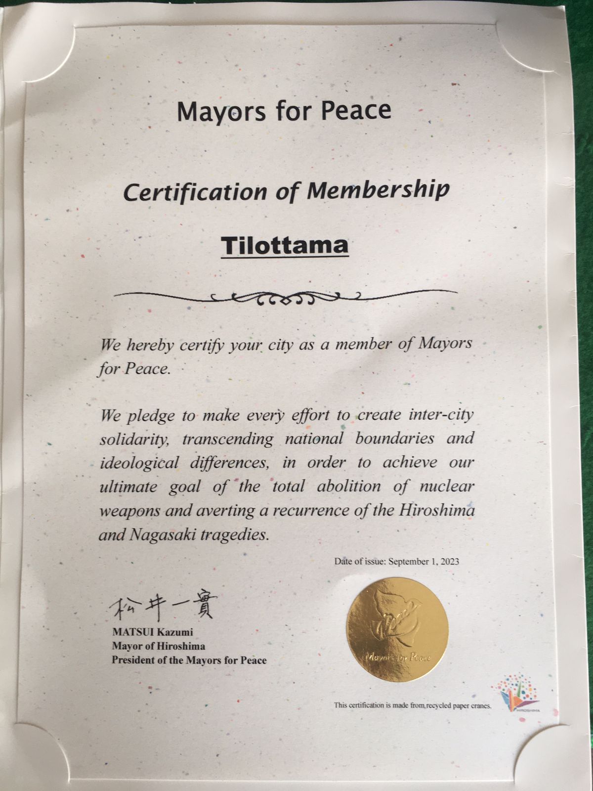तिलोत्तमा । एकपछि अर्को कार्यमा पहिचान बनाउन सफल रुपन्देहीको तिलोत्तमानगरपालिकाले मेयर फर पिस नामक जापानमा रहेको संथाको सदस्यता प्राप्त गरेको छ। स्थानियतहहरुको समृद्धिका लागि एकबद्ध हुने उदेश्यका साथ् स्थापित् शान्ति र बिकासकालागि अघि बढेको सो संस्थाको गतभदौ १५ गते सदस्यताप्राप्त गरेको नगरप्रमुख रामकृष्ण खाणले बताउनुभयो।