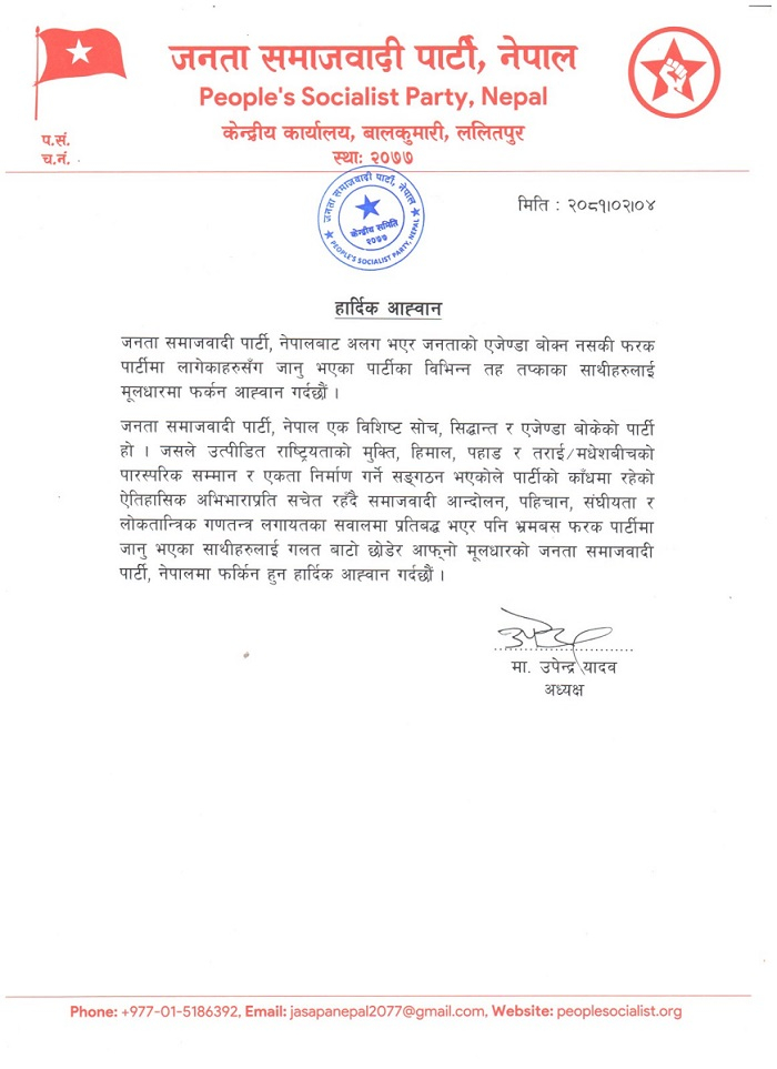 अध्यक्ष यादवले शुक्रबार एक विज्ञप्ति जारी गर्दै सबै नेता कार्यकर्ताहरुलाई पार्टीको मूलधारमा आउन एकताबद्ध भएर पार्टीलाई अघि बढाउन आग्रह गरेका हुन्।