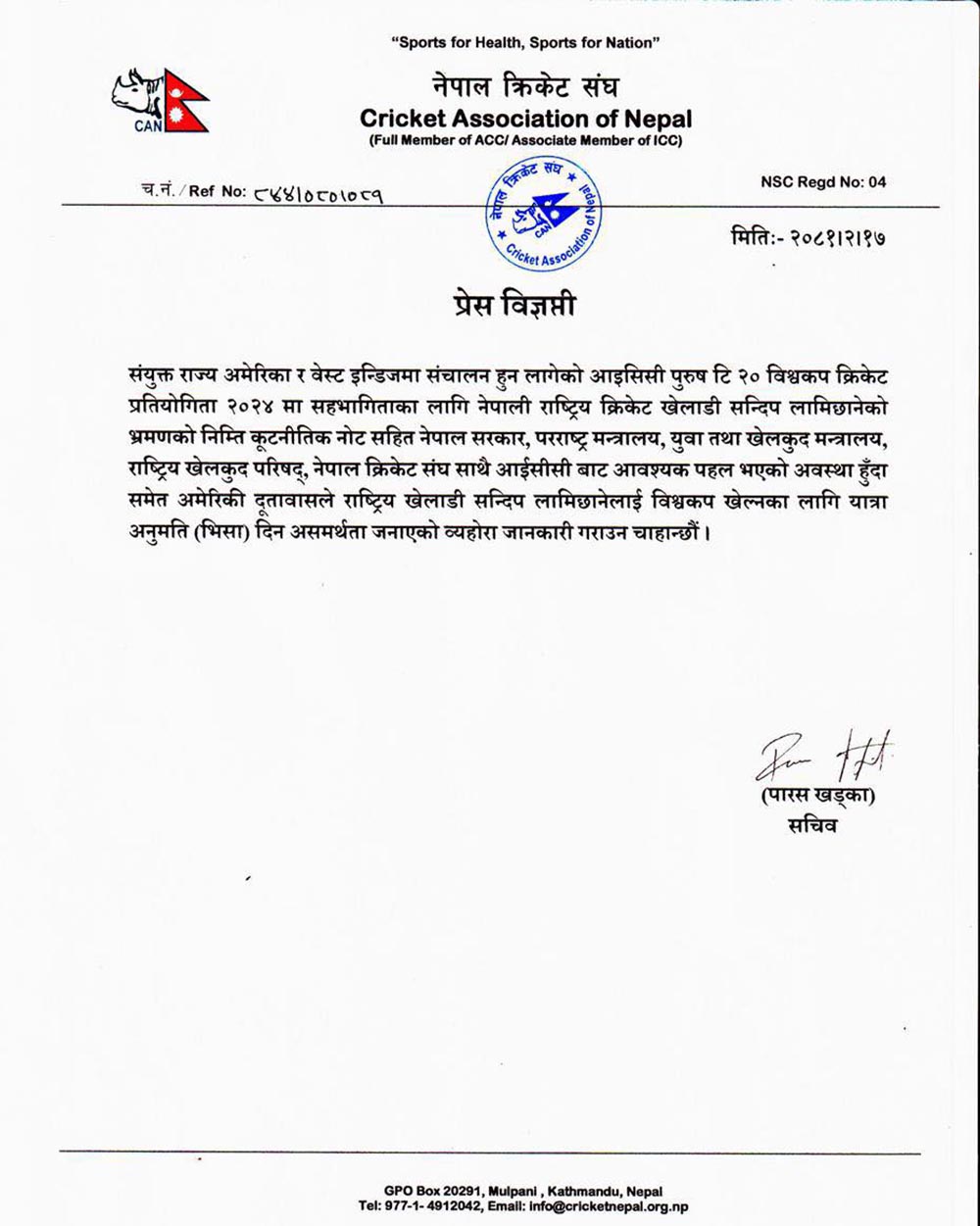 ‘संयुक्त राज्य अमेरिका र वेस्ट इन्डिजमा हुन लागेको आईसिसी पुरुष टी-२० विश्वकप २०२४ मा सहभागिताका लागि नेपाली राष्ट्रिय क्रिकेट खेलाडी सन्दीप लामिछानेको भ्रमणको निम्ति कूटनीतिक नोटसहित नेपाल सरकार, परराष्ट्र मन्त्रालय, युवा तथा खेलकुद मन्त्रालय, राष्ट्रिय खेलकुद परिषद्, नेपाल क्रिकेट संघ साथै आईसीसीबाट आवश्यक पहल भएको अवस्था हुँदासमेत अमेरिकी दूतावासले राष्ट्रिय खेलाडी सन्दिप लामिछानेलाई विश्वकप खेल्नका लागि यात्रा अनुमति (भिसा) दिन असमर्थता जनाएको व्यहोरा जानकारी गराउन चाहन्छौं,’ सचिव खड्काले विज्ञप्तिमा भनेका छन् ।