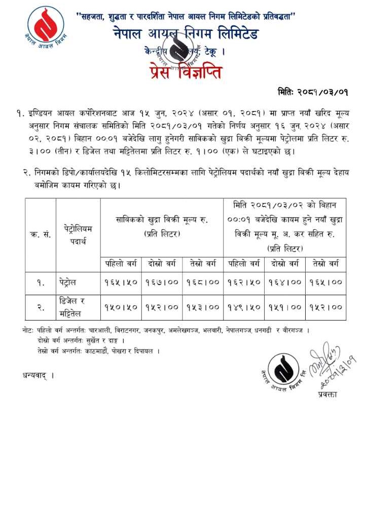 निगमका अनुसार पेट्रोलको मूल्य प्रतिलिटर ३ रुपैयाँले घटाइएको छ भने डिजल र मट्टीतेलको प्रतिलिटर १ रुपैयाँले घटाइएको छ ।