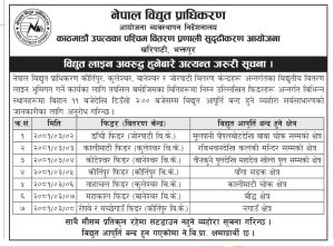 आयोजनाले विद्युतीय लाइन भूमिगत गर्ने कार्यका लागि विभिन्न स्थानमा बिहान ११ बजेदेखि दिउँसो ३ बजेसम्म विद्युत आपूर्ति बन्द हुने जनाएको छ।