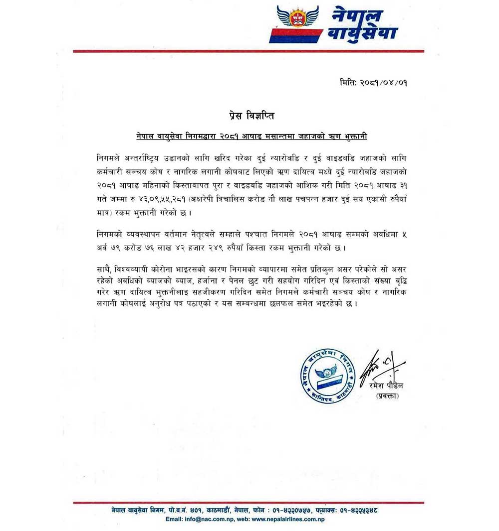 निगमले कर्मचारी सञ्चय कोष र नागरिक लगानी कोषबाट ऋण लिएर दुई न्यारोबडी र दुई वाइडबडी जहाज खरिद गरेको थियो । निगमको पछिल्लो व्यवस्थापन सम्हालेयता २०८१ असारसम्म पाँच अर्ब ७९ करोड ७६ लाख ४२ हजार दुईसय ४९ किस्ता रकम भुक्तानी गरिएको विज्ञप्तिमा जनाइएको छ ।