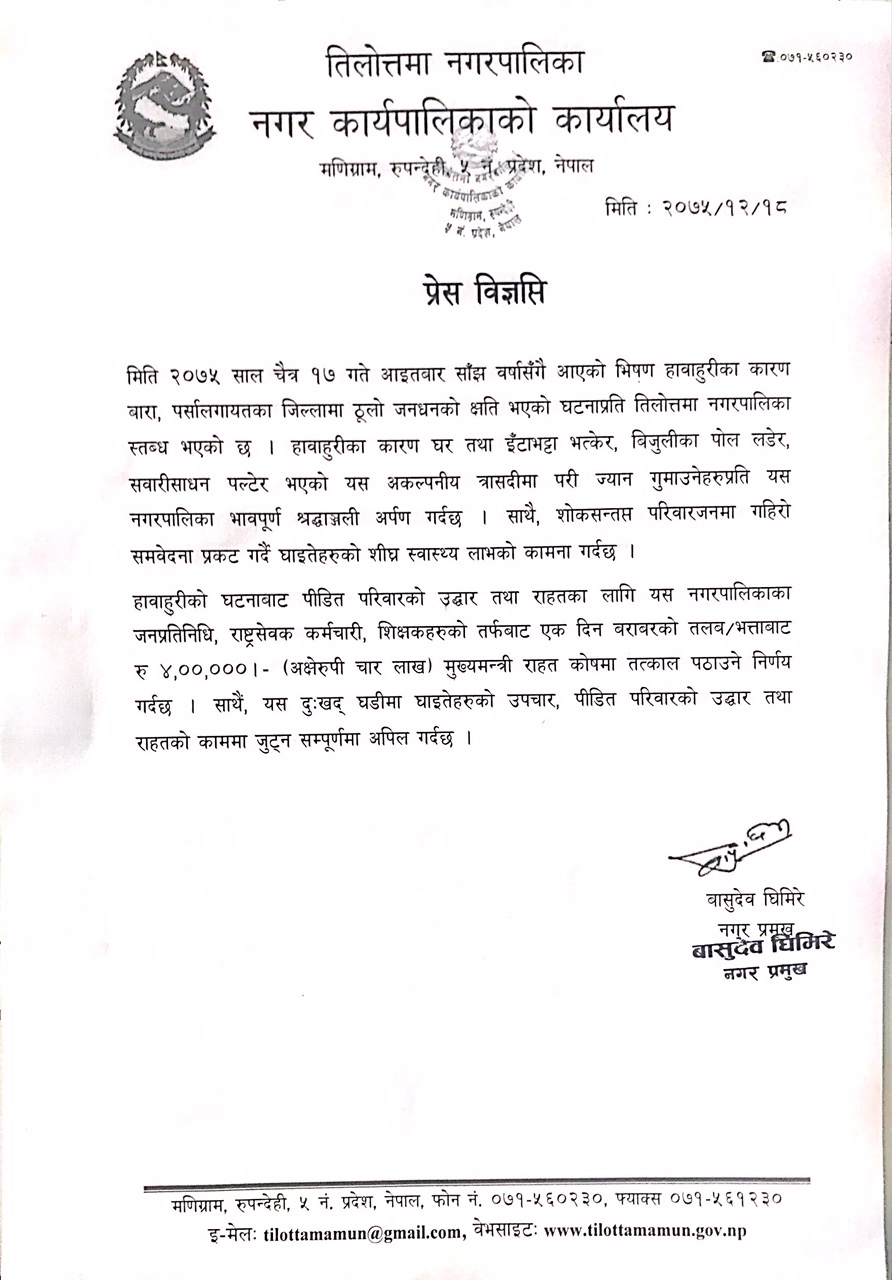 नगर प्रमुख बासुदेव घिमिरेले सोमबार एक विज्ञप्ति जारी गर्दै हावाहुरीको घटनाबाट पीडित परिवारको उद्धार तथा राहतका लागि नगरपालिकाका जनप्रतिनिधि, राष्ट्रसेवक कर्मचारी, शिक्षकहरुको तर्फबाट एक दिन बराबरको तलब÷भत्ताबाट चार लाख मुख्यमन्त्री राहत कोषमा तत्काल पठाउने निर्णय गरिएको जनाउनु भएको छ ।