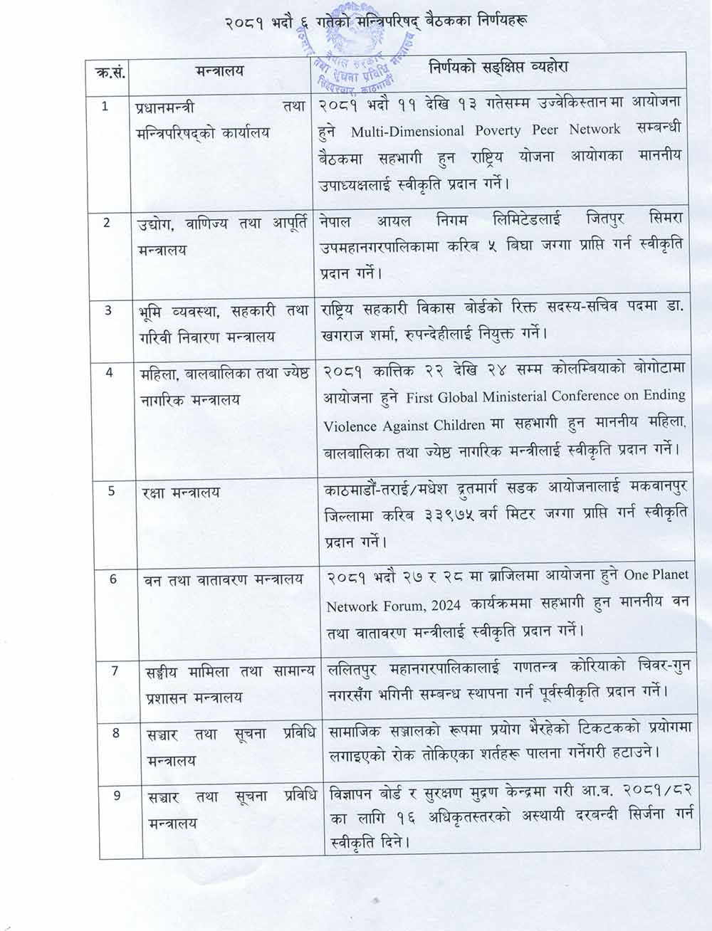 मन्त्रिपरिषदका निर्णयहरु: