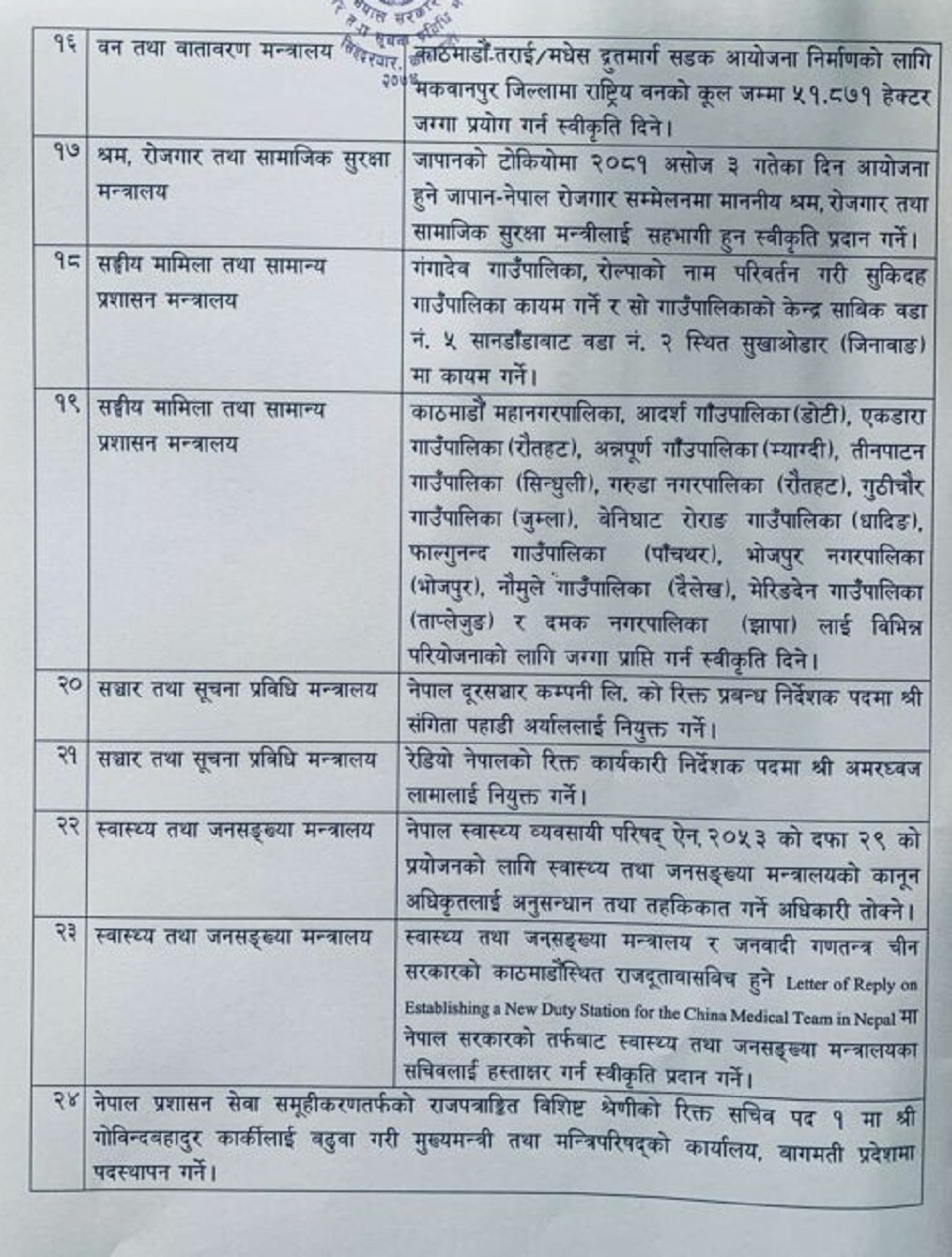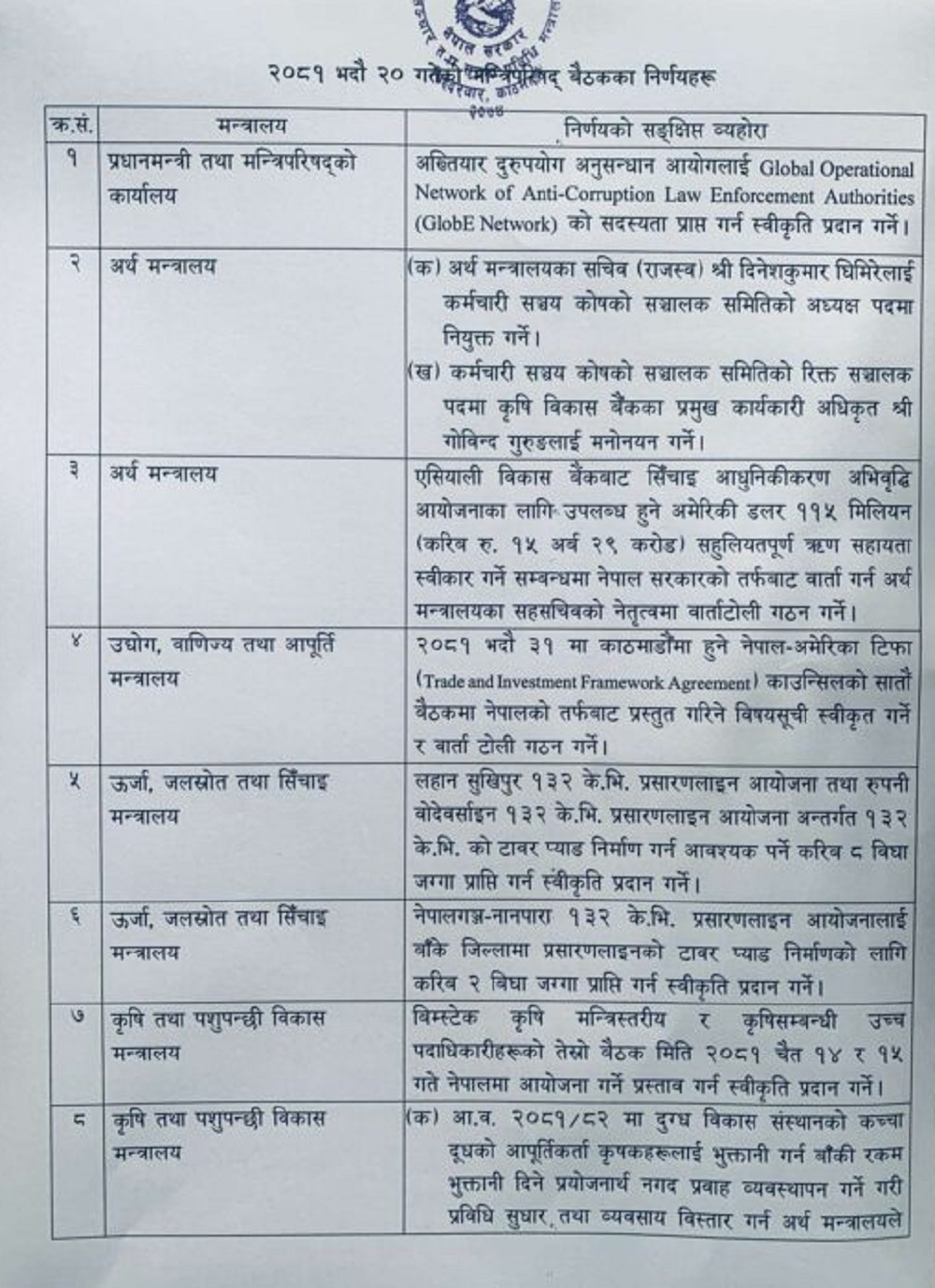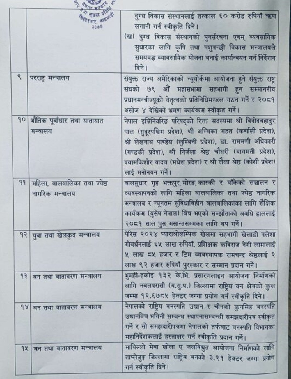 मन्त्रिपरिषद्को बैठकका निर्णयहरु: