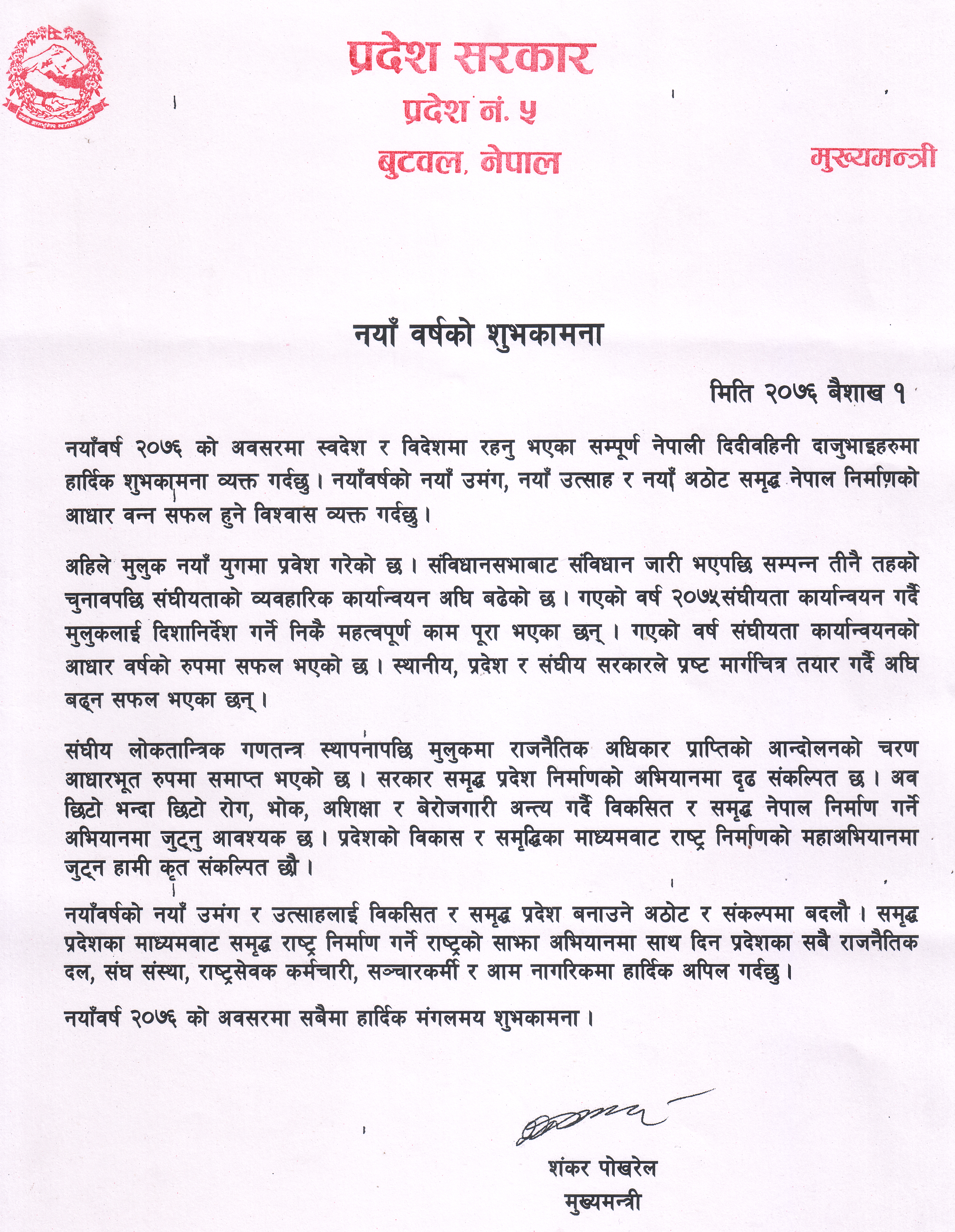 नवबर्ष २०७६ को अवसरमा प्रदेश ५ का मुख्य मन्त्री शंकर पोख्रेलद्धारा शुुभकामना ब्यक्त