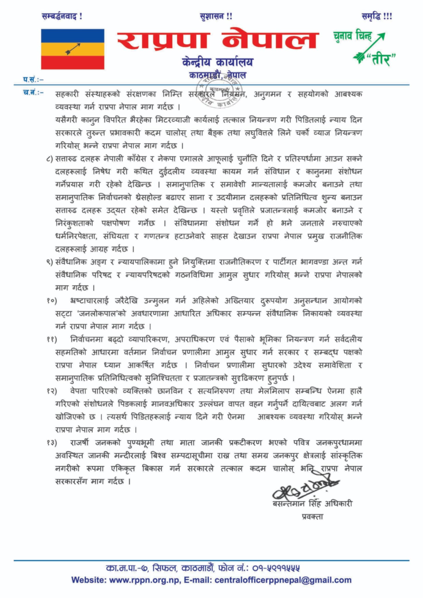 अख्तियार दुरूपयोग अनुसन्धान आयोगको सट्टा जनलोकपाल गठन गर्नु पर्ने उसले आफनो माग अघि सारेको छ । ‘भ्रष्टचारलाइ जरै देखी उन्मुलन गर्न अहिलेको अख्तियार दुरूपयोग अनुसन्धान आयोगको सट्टा ‘जनलोकपाल’को अबधारणामा आधारित सम्पन्न संबैधानिक निकायको ब्यवस्था गर्न राप्रपा नेपाल माग गर्दछ,’ जारी बिज्ञप्तिमा भनिएको छ ।