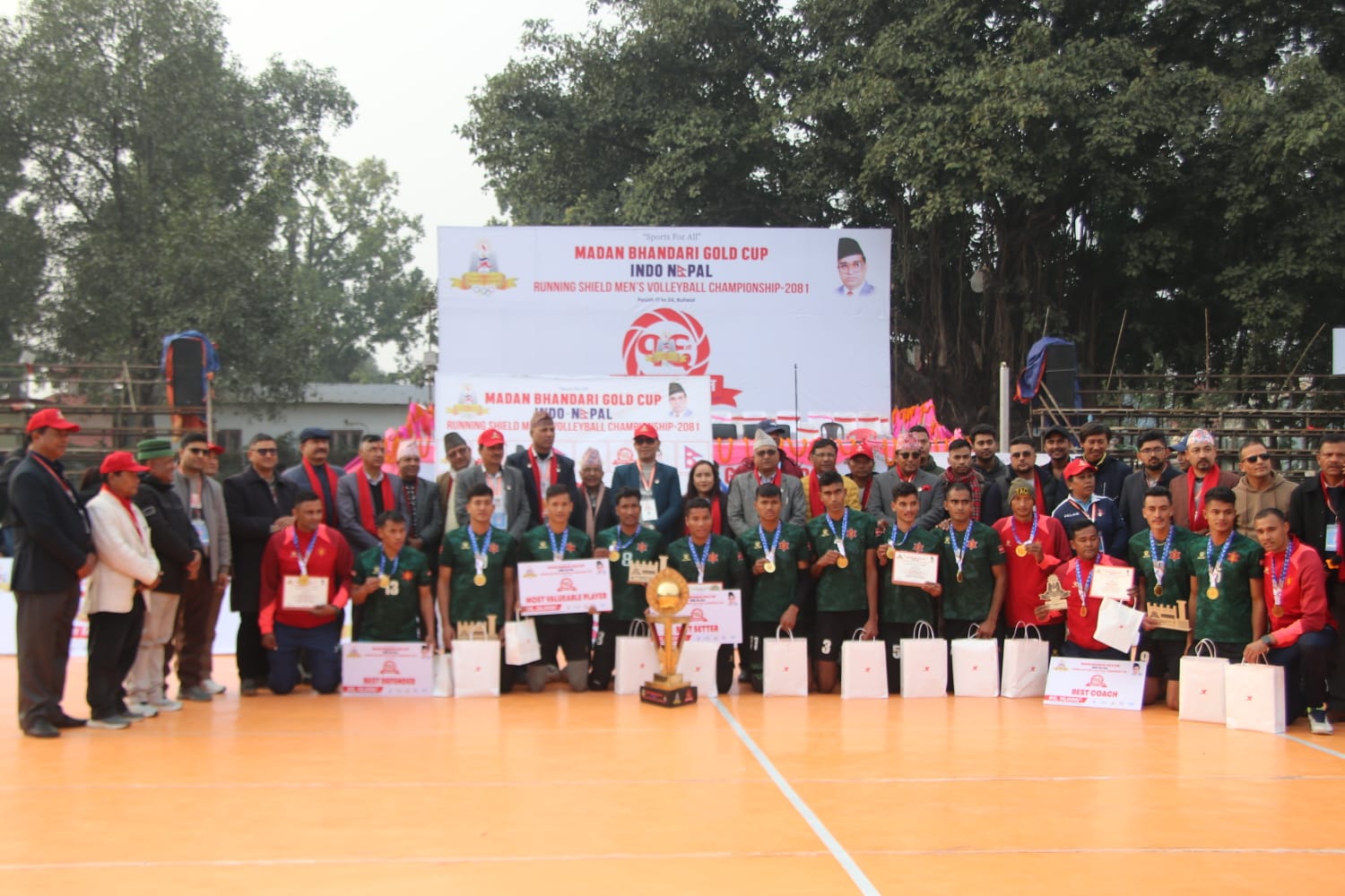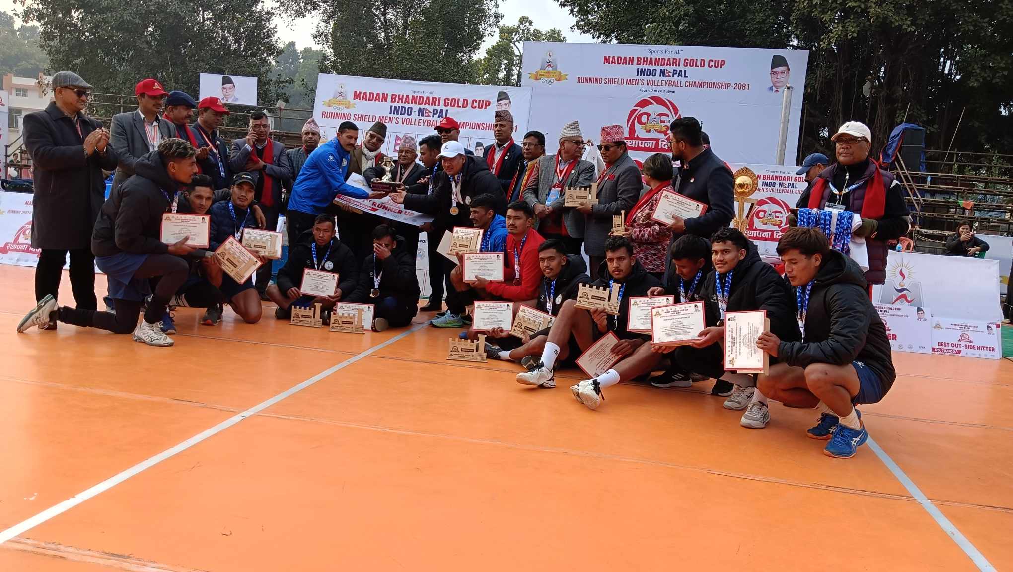 बुटवल । विभागिय टिम त्रिभुवन आर्मी क्लबले बुटवलमा आयोजित मदन भण्डारी गोल्डकप इन्डो–नेपाल रनिङ शिल्ड पुरुष भलिबल च्याम्पियनसिप–२०८१ को उपाधि जितेको छ।