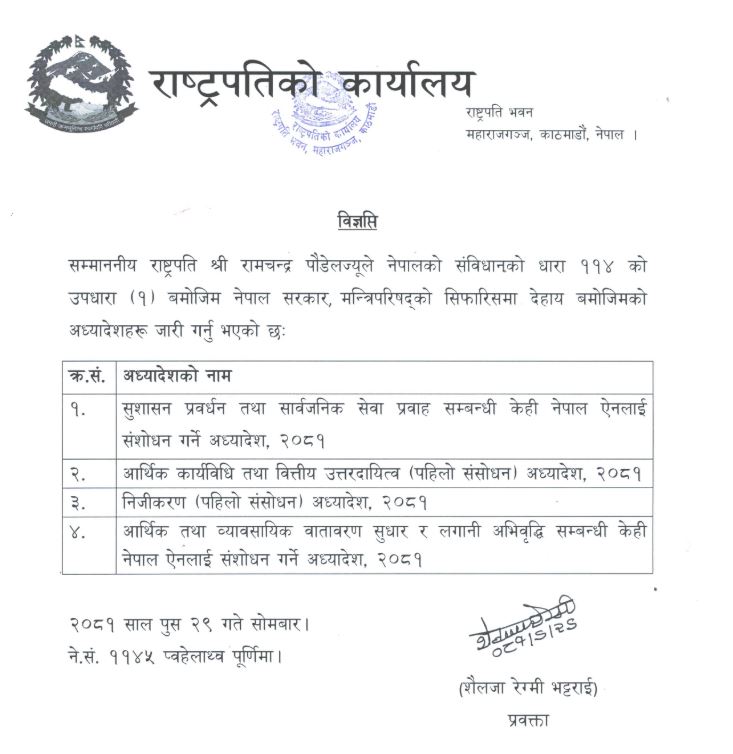 राष्ट्रपतिको कार्यालयका प्रवक्ता शैलजा रेग्मी भट्टराईले जारी गरेको बिज्ञप्तिअनुसार राष्ट्रपति पौडेलले सुशासन प्रवर्धन तथा सार्वजनिक सेवा प्रवाह सम्बन्धी केही नेपाल ऐनलाई संशोधन गर्ने अध्यादेश– २०८१, आर्थिक कार्यविधि तथा वित्तीय उत्तरदायित्व (पहिलो संशोधन) अध्यादेश– २०८१, निजीकरण (पहिलो संशोधन) अध्यादेश– २०८१ र आर्थिक तथा व्यावसायिक वातावरण सुधार र लगानी अभिवृद्धि सम्बन्धी केही नेपाल ऐनलाई संशोधन गर्ने अध्यादेश–२०८१ जारी गरेका हुन् ।