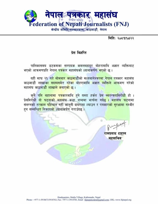 सो घटना प्रति नेपाल पत्रकार महासंघको ध्यानाकर्षण भएको महासचिव रामप्रसाद दाहालले जनाएका छन् ।
