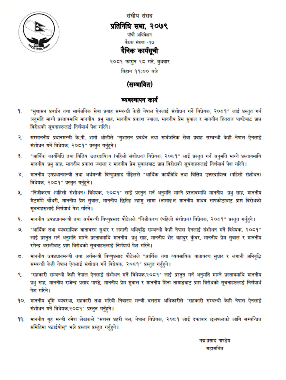 आजको बैठकमा विभिन्न ११ वटा विधेयक पेश गर्ने कार्यसूची रहेको छ ।