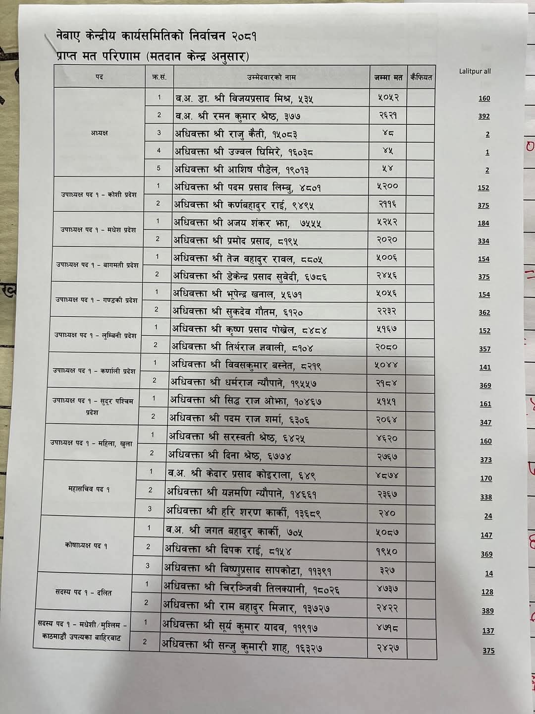 त्यस्तै महासचिवमा कांग्रेस–एमाले प्यानलका केदार प्रसाद कोइराला ४ हजार ८७४ मत ल्याएर विजयी हुँदा यज्ञमणि न्यौपानेले २ हजार ३६७ मतमा सिमित भएका छन् ।