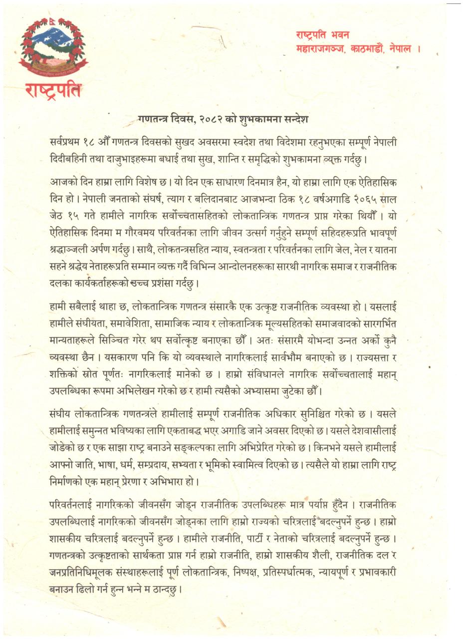 गणतन्त्र दिवस, २०८२ को अवसरमा शुभकामना दिदैँ राष्ट्रपति पौडेलले शासकीय चरित्र, राजनीति, पार्टी र नेताको चरित्रलाई बदल्नुपर्ने पनि बताएका हुन ।