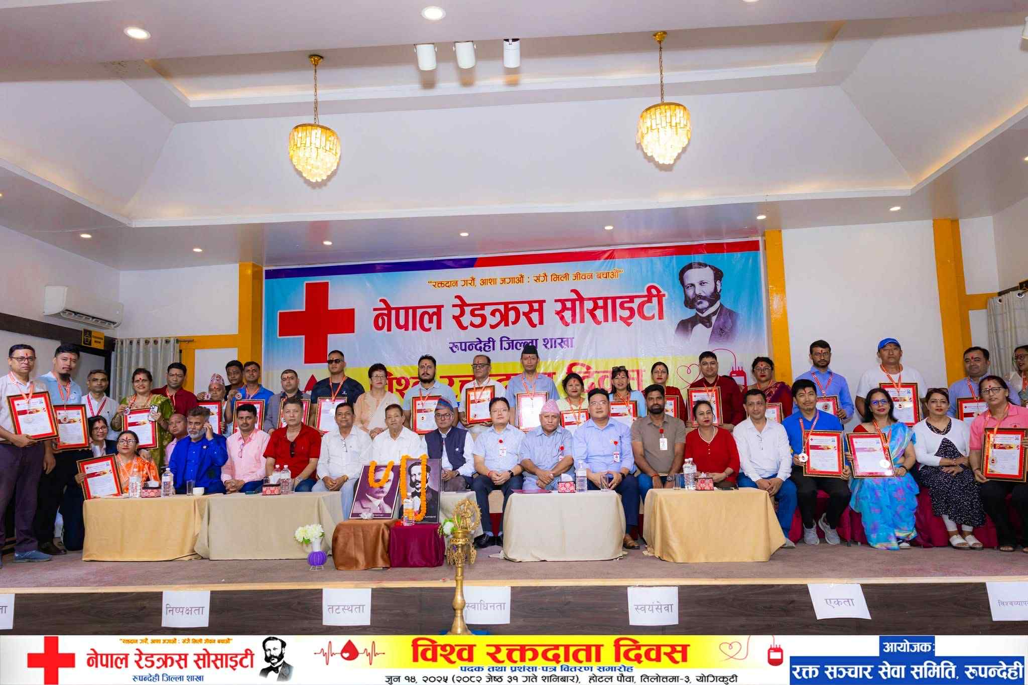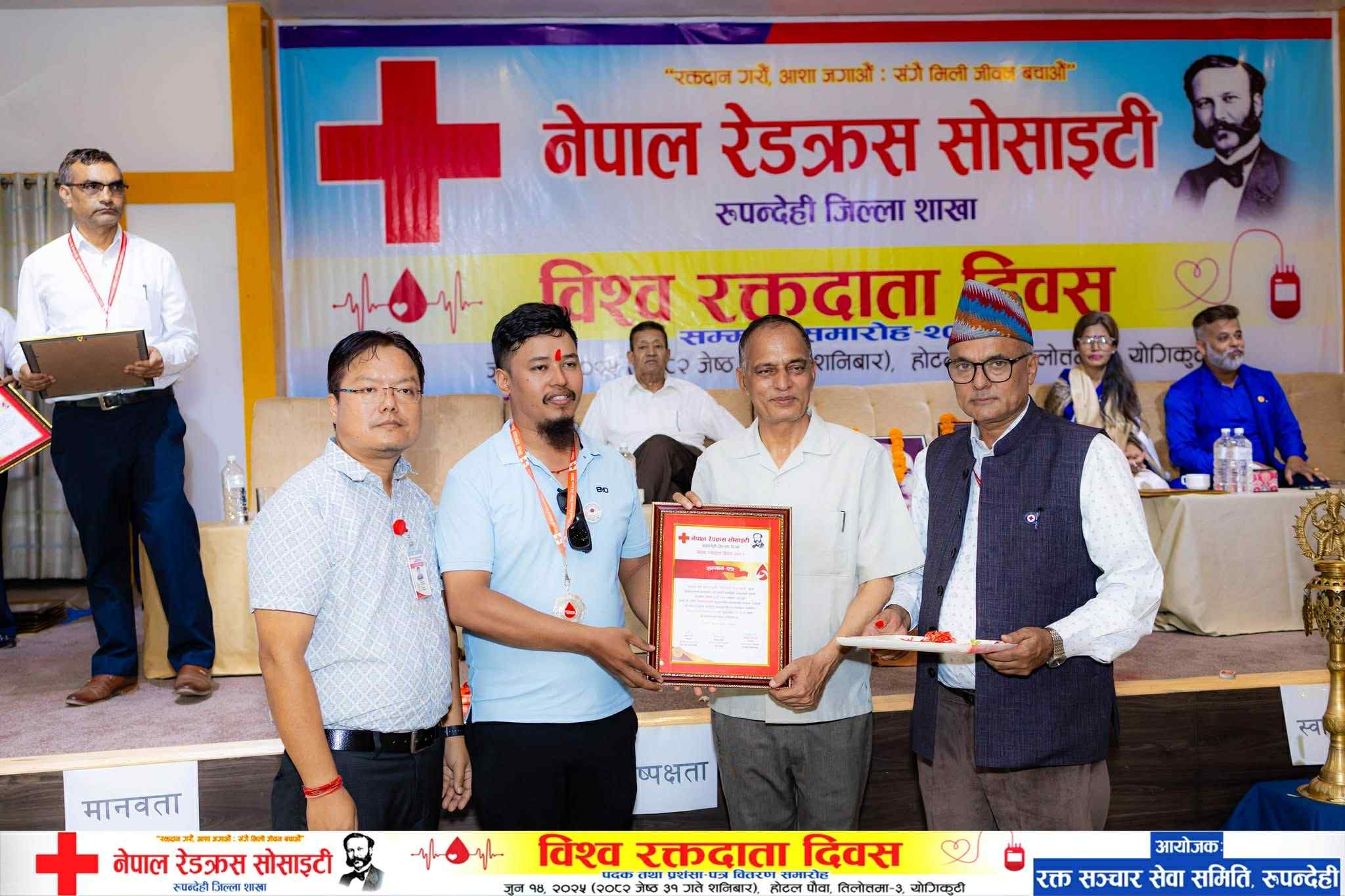 उक्त दिन नेपाल रेडक्र्स सोसाइटीले एक कार्यक्रमका बिच नेपाल नियमीत रक्तदाता संघ का सस्थापक अध्यक्ष स्व सरोज सिलवाल बन्दि र उहाँको छोरा नेपाल नियमित रक्तदाता संघ रुपन्देही जिल्लाका अध्यक्ष अषेस सिलवाललाई २५औ पटक को रजत पदबाट सम्मान गरेको थियो । तेसैगरी संघका संरक्षक मृगेन्द्र कुमार शेरचनलाई पनि समान गरिएको थियोे ।