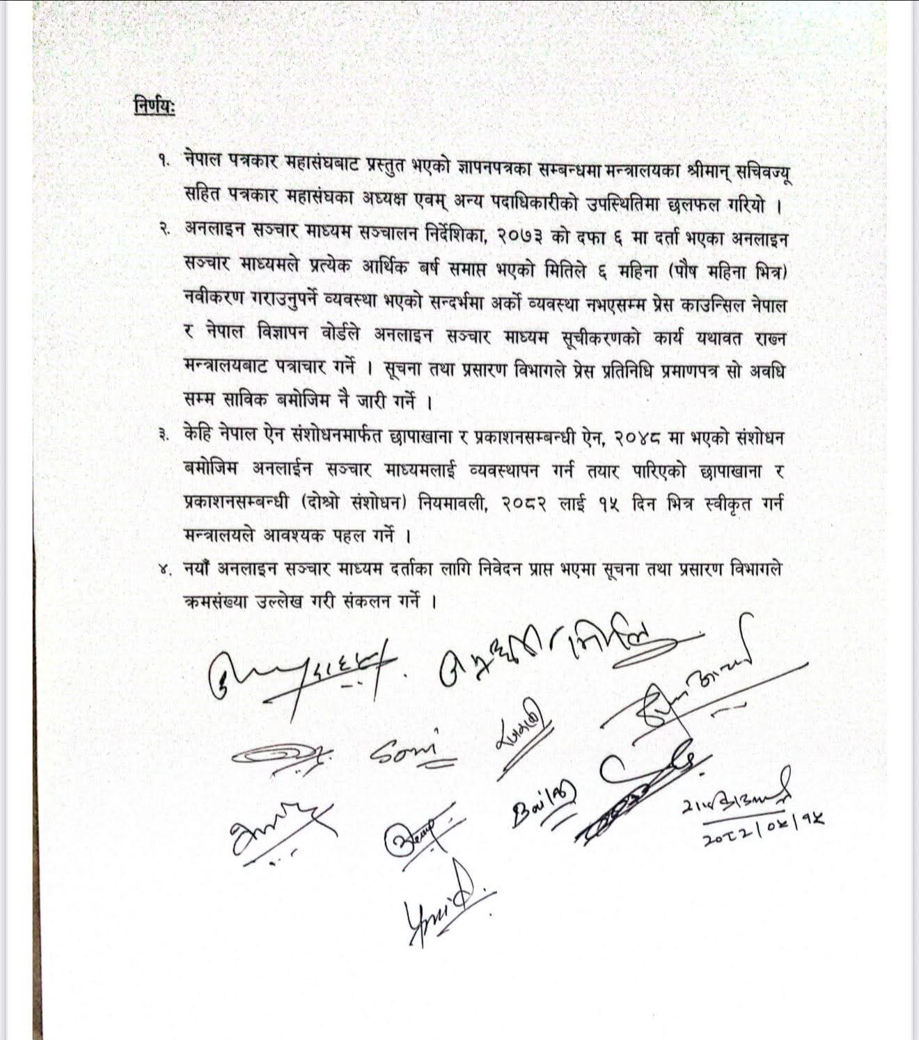 साथै, अनलाइन सञ्चारमाध्यम सञ्चालन निर्देशिका २०७३ को दफा ६ मा दर्ता भएका अनलाइन सञ्चार माध्यमले प्रत्येक आर्थिक वर्ष समाप्त भएको मितिले ६ महिना (पौष महिना भित्र) नवीकरण गराउनु पर्ने व्यवस्था भएको सन्दर्भमा अर्को व्यवस्था नभएसम्म प्रेस काउन्सिल नेपाल र नेपाल विज्ञापन बोर्डले अनलाइन सञ्चारमाध्यम सूचीकरणको कार्य यथावत् राख्न मन्त्रालयबाट पत्राचार गर्नेलगायत ४ बुदेँ सहमति भएको हो ।