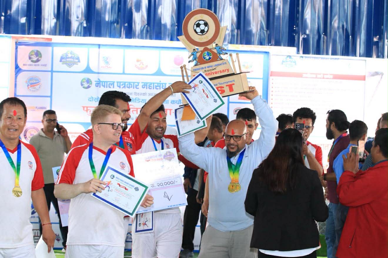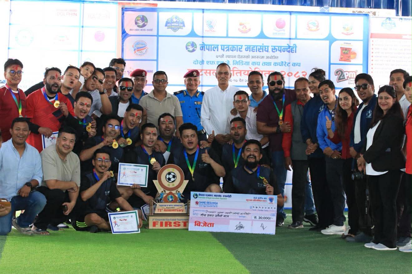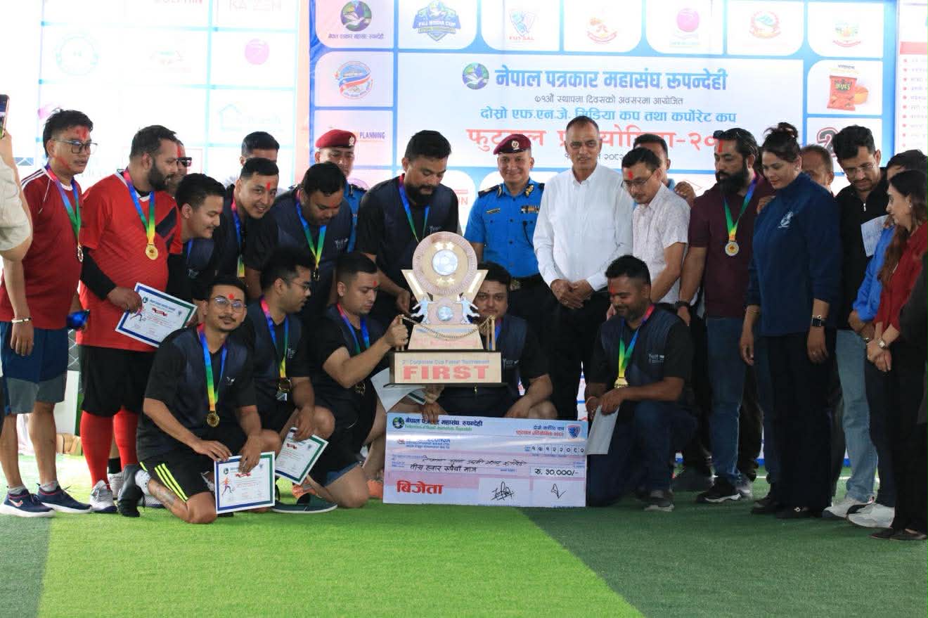 बुटवल । नेपाल पत्रकार महासंघ रुपन्देहीले आयोजना गरेको दोस्रो एफएनजे मिडिया कप तथा कर्पोरेट कप फुटसल प्रतियोगिताको उपाधि ग्लोबल आवाज र नेपाल युवा उद्यमी मञ्च रुपन्देहीले जितेको छ । ७१ औ स्थापना दिवसको अवसरमा रुपन्देही शाखाले बुटवलमा सोमबार र मंगलबार आयोजना गरेको फुटसल प्रतियोगितामा दोश्रो दिन भएको मिडिया कपमा बुद्ध सामुदायिक टेलिभिजनलाई ३–२ गोल अन्तरले हराउँदै ग्लोबल आवाजले उपाधि जितेको हो । उपाधि जित्दै ग्लोबलले नगद २० हजारसहित शिल्ड, मेडल र प्रमाण पत्र प्राप्त गरेको छ । यस्तै उपविजेता बनेको बुद्ध सामुदायिक टेलिभिजनले नगद १५ हजारसहित शिल्ड,मेडल र प्रमाणपत्र प्राप्त गरेको छ । यस्तै आज नै भएको कर्फोरेट कपको खेलमा नेपाल इन्जिनियर्स एशोसियसन लुम्बिनी प्रदेशलाई २–० गोल अन्तरले पराजित गर्दै नेपाल युवा उद्यमी मञ्च रुपन्देहीले उपाधि जितेको छ । उपाधि जित्दै युवा उद्यमी मञ्चले ३५ हजारसहित शिल्ड, मेडल र प्रमाण पत्र प्राप्त गरेको छ भने उपबिजेता बनेको इन्जिनियर्स एशोसियसनले २५ हजारसहित शिल्ड, मेडल र प्रमाण पत्र प्राप्त गरेको छ । प्रतियोगिता २ दिन सञ्चालन गरिएको हो । बुटवल उपमहानगरपालिकाको संरक्षकत्व नेपाल पत्रकार महासंघ रुपन्देहीको आयोजनामा दोस्रो एफएनजे मिडिया कप तथा कर्पोरेट कप फुटसल प्रतियोगिता २०८२ गरिएको हो । यस्तै मिडिया कप तर्फ उत्कृष्ट खेलाडीमा ग्लोबल आवाजका डिबी सुस्लिङ, सर्वाधिक गोलकर्तामा बुद्ध सामुदायिक टेलभिजनका स्वस्तिक श्रेष्ठ र उत्कृष्ट गोल रक्षकमा ग्लोबल आवाजका प्रकाश न्यौपाने बनेका छन । यस्तै कर्पोरेट कपमा सर्वाधिक गोलकर्तामा ईन्जिनियर्स एशोसियसनका क्रितेश श्रेष्ठ, उत्कृष्ट खेलाडीमा युवा उद्यमी मञ्चका मञ्जिल विक र उत्कृष्ट गोलरक्षकमा राहुल कौशधन भएका छन । प्रतियोगिताका उपाधि बिजेता ,उपबिजेता तथा खेलाडिहरुलाई बुटवल उपमहानगपालिकाका प्रमुख खेलराज पाण्डेय, महासंघ रुपन्देहीका अध्यक्ष दिनेश पाण्डेय , नेपाल प्रहरी लुम्बिनी प्रदेशका प्रमुख भूपेन्द्रबहादुर खत्री , ईलाका प्रहरी कार्यालय बुटवलका प्रमुख निशान्त श्रीवास्तव लगायतले पुरस्कार प्रदान गर्नुभएको प्रतियोगिताका संयोजक सुमनरश्मी श्रेष्ठले जानकारी दिनु भयो । यस्तै नेपाल पत्रकार महासंघ रुपन्देहीले स्थापना गरेको पत्रकारिता पुरस्कार सुमन अधिकारीलाई प्रदान गरेको छ । यस्तै नेपाल पत्रकार महासंघ रुपन्देहीले स्थापना गरेको पत्रकारिता पुरस्कार सुमन अधिकारीलाई प्रदान गरेको छ । जिल्लामा रहेर खेलकुद पत्रकारितामा योगदान गरेको भन्दै अधिकारीलाई नगद २५ हजारसहित सम्मान गरिएको महासंघका सचिब सिपी खनालले जानकारी दिनु भयो ।