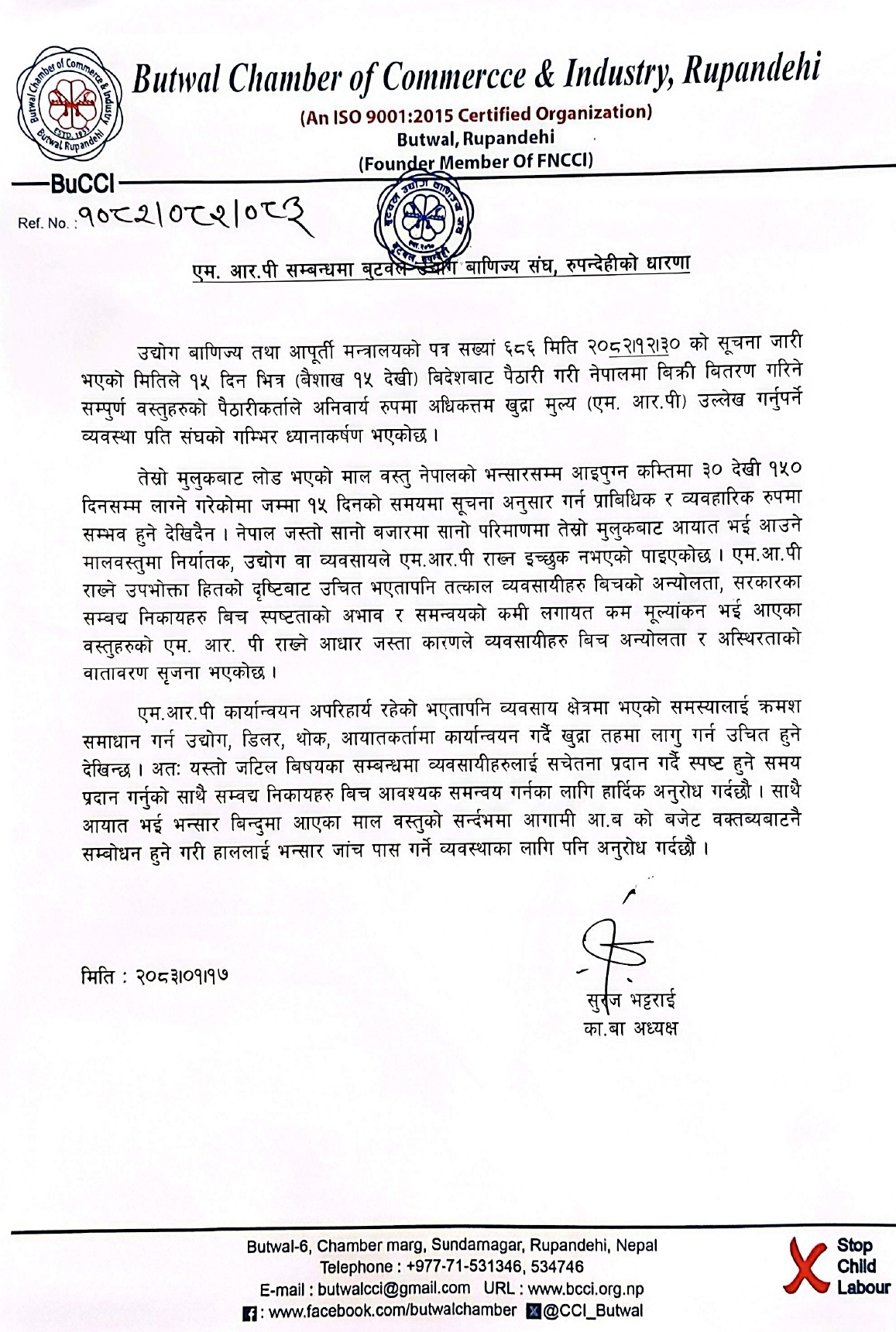 बुटवल उद्योग वाणिज्य संघले भन्यो – एम.आर.पी. कार्यान्वयन गर्न स्पष्टता र समय चाहिन्छ