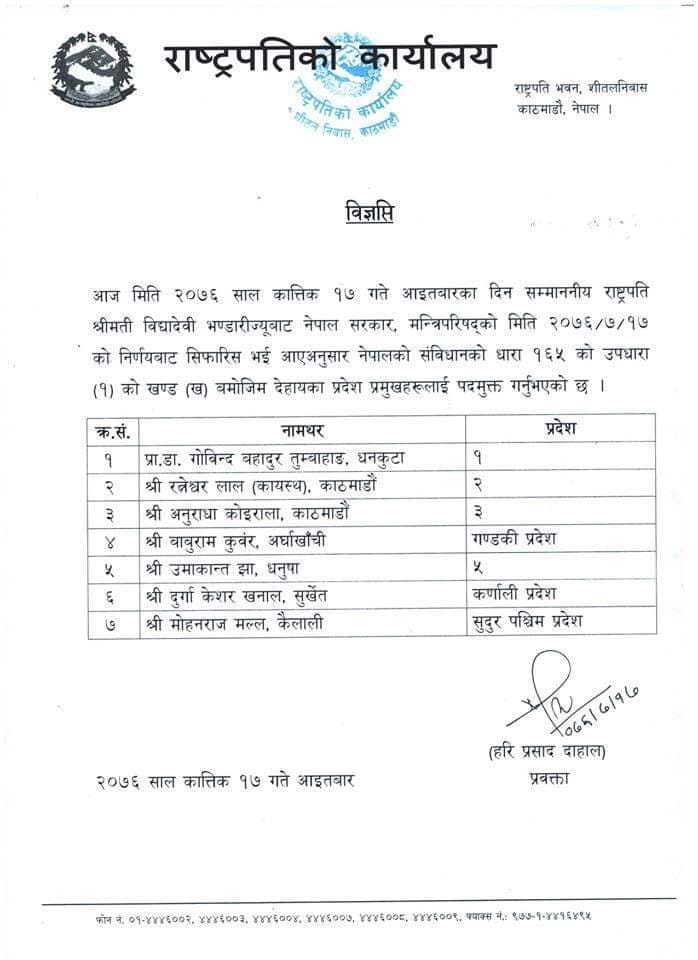 मन्त्रिपरिषद्को आइतबारको बैठकबाट सिफारिस भए अनुसार राष्ट्रपति भण्डारीले उनीहरूलाई पद मुक्त गरेको राष्ट्रपतिको कार्यालयबाट जारी प्रेस विज्ञप्तिमा जनाइएको छ ।
