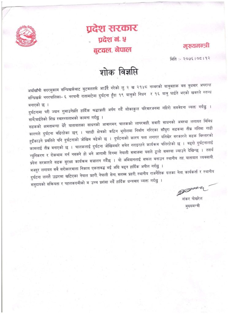 अर्घाखाँची सदरमुकाम सन्धिखर्कबाट बुटवलतर्फ आउँदै गरेको लु २ ख २१४८ नम्बरको यात्रुबहाक बस बुधबार अपरान्ह सन्धिखर्क नगरपालिका–६ नरपानी रातामाटेमा दुर्घटना हुँदा १९ यात्रुको निधन र १६ यात्रु घाईते भएको खबरले स्तब्ध बनाएको छ । दुर्घटनामा परी ज्यान गुमाउनेप्रति हार्दिक श्रद्धाञ्जली अर्पण गर्दै शोकाकुल परिवारजनमा गहिरो समवेदना व्यक्त गर्दछु । साथै, घाईतेको शिघ्र स्वास्थ्यलाभको कामना गर्दछु ।