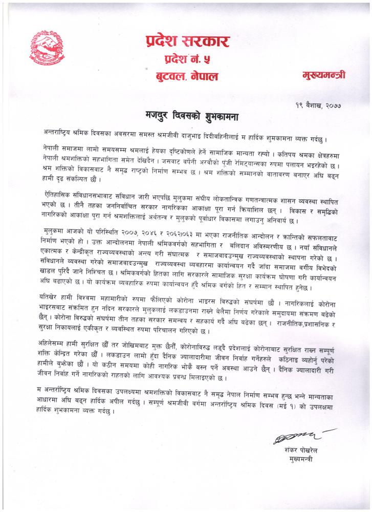 मुख्यमन्त्रीद्धारा श्रमिक दिवसको अवसरमा शुभकामना सन्देश
