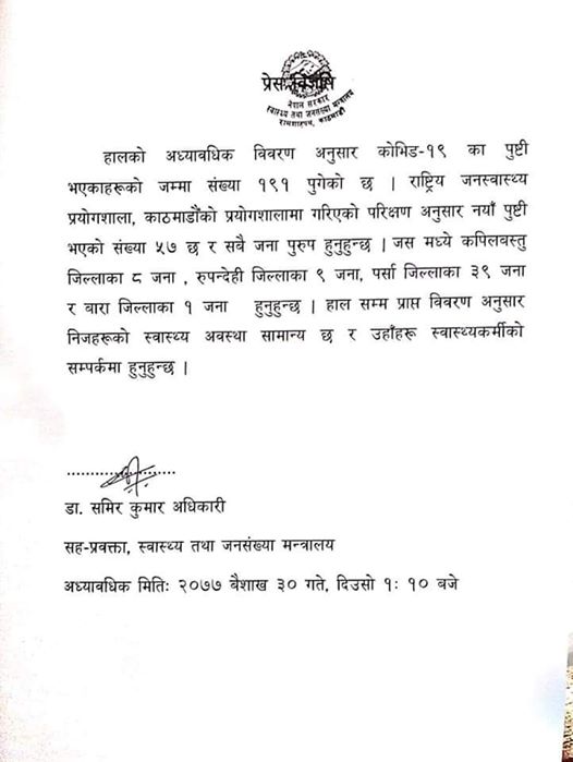 यससंगै नेपालमा कोरोना संक्रमितको संख्या १९१ पुगेको छ । ति मध्ये ३३ जना निको भैसकेका छन् ।