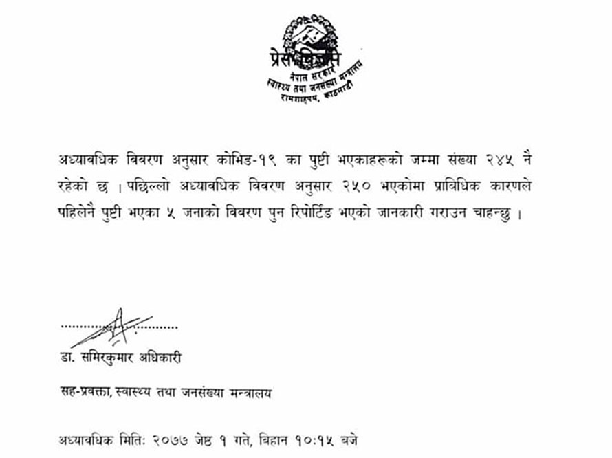 मन्त्रालयले यसअघि सार्वजनिक गरेको सूचनामा ५ जना संक्रमित प्राविधिक त्रुटिवश दोहोरिएको भन्दै आँकडा सच्याएको हो ।