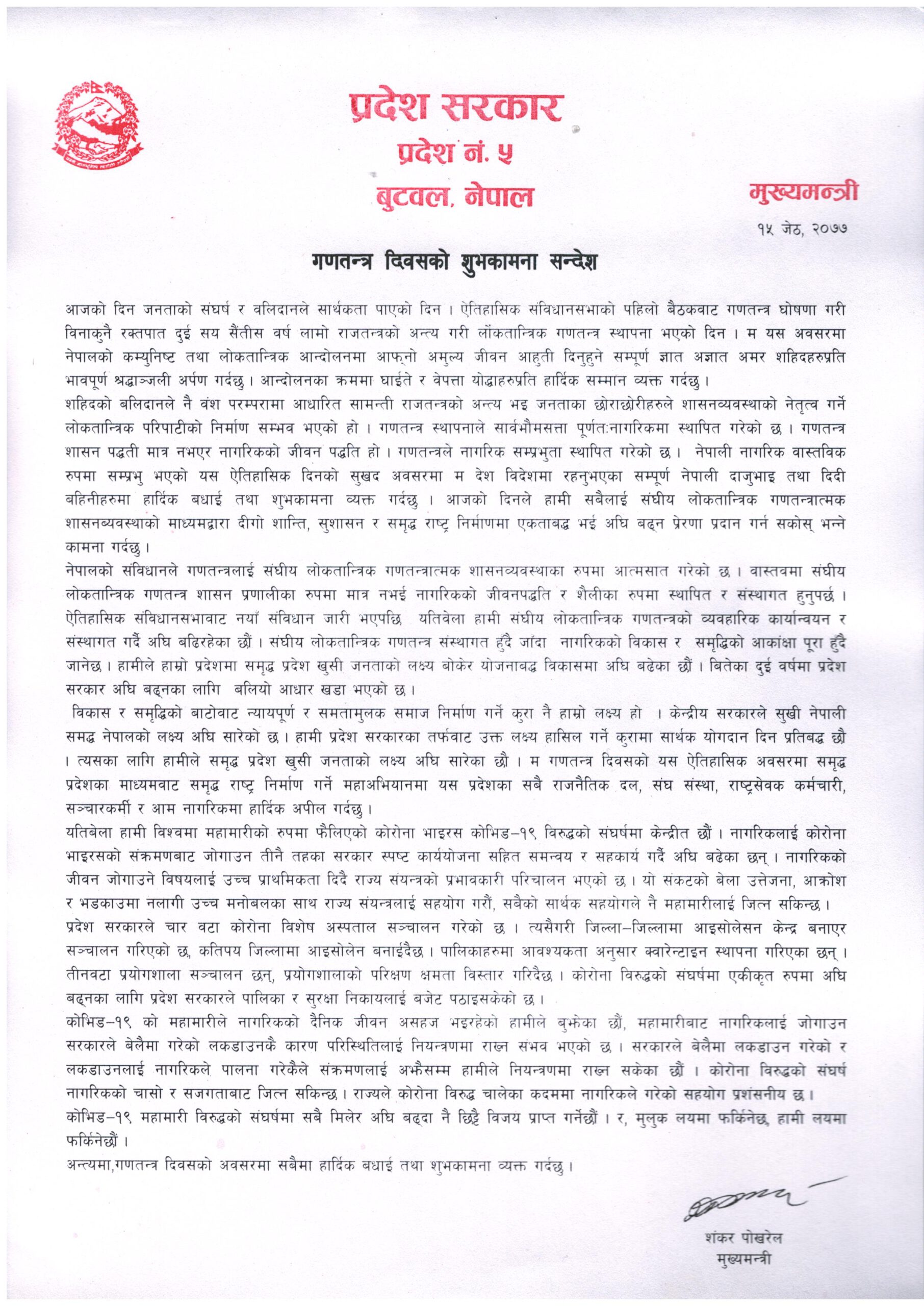 प्रदेश ५ का मुख्यमन्त्री शंकर पोख्रेलद्धारा गणतन्त्र दिवशको अवसरमा शुभकामना ब्यक्त गर्नुभएको छ । मुख्यमन्त्री पोख्रेलले एक प्रेस बिज्ञप्ती मार्फत गणतन्त्र दिवसको अवसरमा सबैमा शुभकामना ब्यक्त गर्नु भएको हो ।