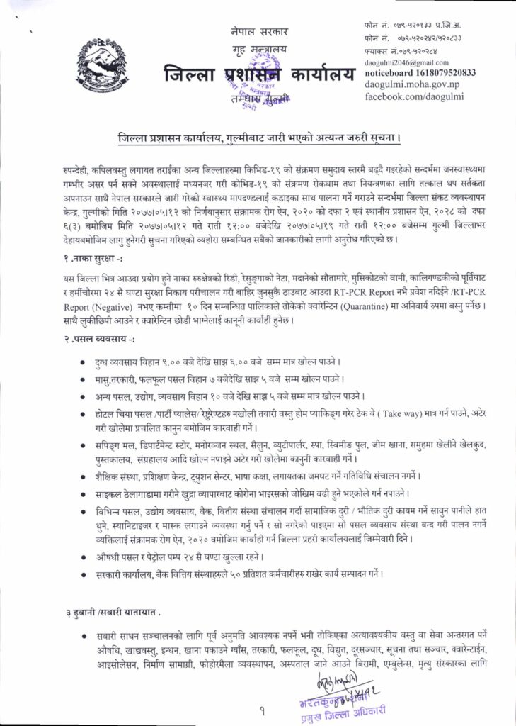 जिल्ला बाहिरबाट पसल तथा व्यवसायीक सामाग्री ढुवानी गर्दा चालक र सहचालकको पिसिआर रिपोर्ट चाहिने भएको छ । यदि पिसिआर रिपोर्ट नभए १० दिन क्वारेन्टीनमा बस्नुपर्ने निर्णय भएको छ । जिल्लामा लुकीछिपी आउने र क्वारेन्टिनबाट भाग्नेलाई कारवाही गर्ने जिल्ला प्रशासन कार्यालय गुल्मीले जनाएको छ । कसैले जिल्ला प्रशासनको निर्णय अवज्ञा गरे संक्रामक रोग ऐन २०२० र स्थानीय प्रशासन ऐन २०२८ अनुसार कारबाही गर्ने जिल्ला प्रशासन कार्यालय गुल्मीले जनाएको छ ।