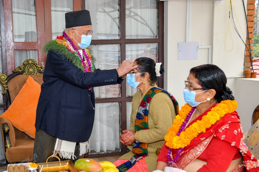 कोइरालाले प्रधानमन्त्री ओलीलाई सप्तरंगी टीका, मखमलीका साथै दुबोको माला लगाईदिनुभएको थियो । प्रधानमन्त्री पत्नी राधिका शाक्यलाई समेत कोइरालाले टीका लगाईदिनु भएको थियो ।
