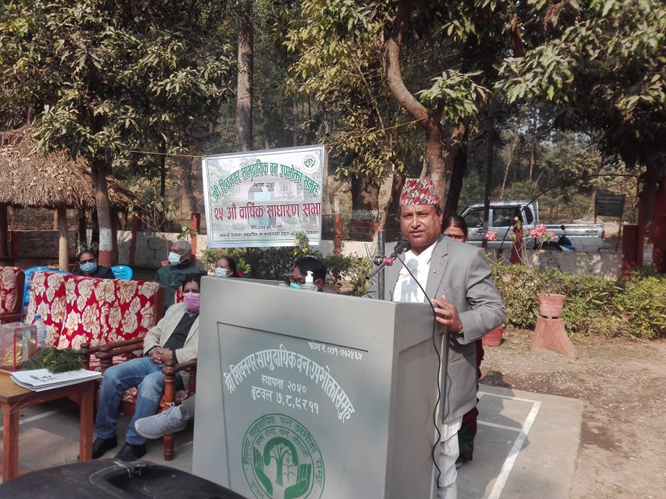 बुटवल । शिवनगर सामुदायिक बनको २५ औं बार्षिक साधारण सभा आज (शनिबार) सम्पन्न भएको छ । साधारण सभाको प्रमुख अथिति बुटवल उपमहानगर पालिकाका मेयर शिवराज सुवेदीले उद्धघाटन गर्दे मानव र प्रकृतिको सन्तुलन गर्नु हाम्रो दायित्व भएको बताउनु भएको छ । उहाँले बिश्व बातावरणमा भईरहेको असन्तुलनका लागी योगदान स्वरुप बुटवलबाट कति कार्बन उत्सर्जन गर्न सकिन्छ भन्ने तिर आफनो ध्यान रहेको बताउनुभयो । जसका लागी १७ वटै सामुदायिक बनसंगको सहकार्यमा बैज्ञानिकबनको अवधारणाको कार्यान्वयनका लागी योजनाबद्ध तरिकाले अगाडी बढिरहेको पनि बताउनुभयो । मेयर सुबेदीले बुटवलले हरियाली मापन गर्ने गरी कार्य गर्दे दुरगामी कार्ययोजनाकालागी अध्ययन गरी अगाढी बढ्ने बताउनुभयो ।सुवेदीले बुटवलमा ५३ प्रतिशत हरियाली रहेको पनि बताउनुभयो। सुवेदीले बुटवलमा रहेको प्राचिन सभ्यतालाई झल्किने गरी पर्यटनको बिकाश गरीने जसका लागी बिग बुद्धको योजना ,जितगढी, सिद्धबाबा र नरेश्वर जस्ता एैतिहासिक धार्मिक बिकाशको मोडेल अनुसार काम भईरहेको पनि बताउनुभएको छ ।